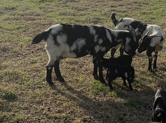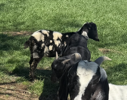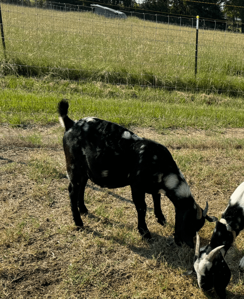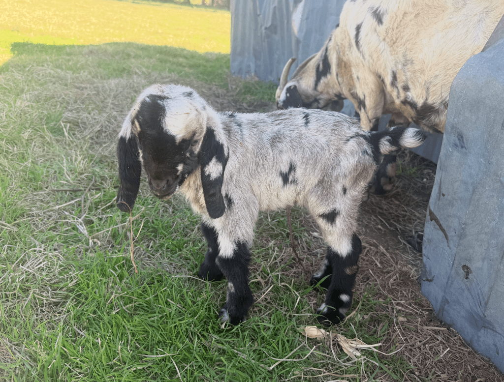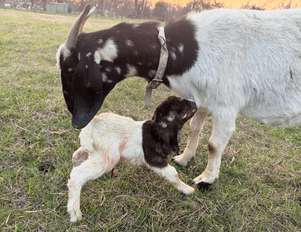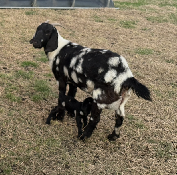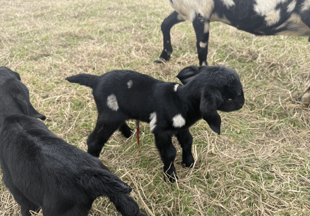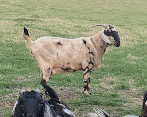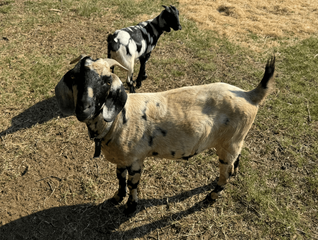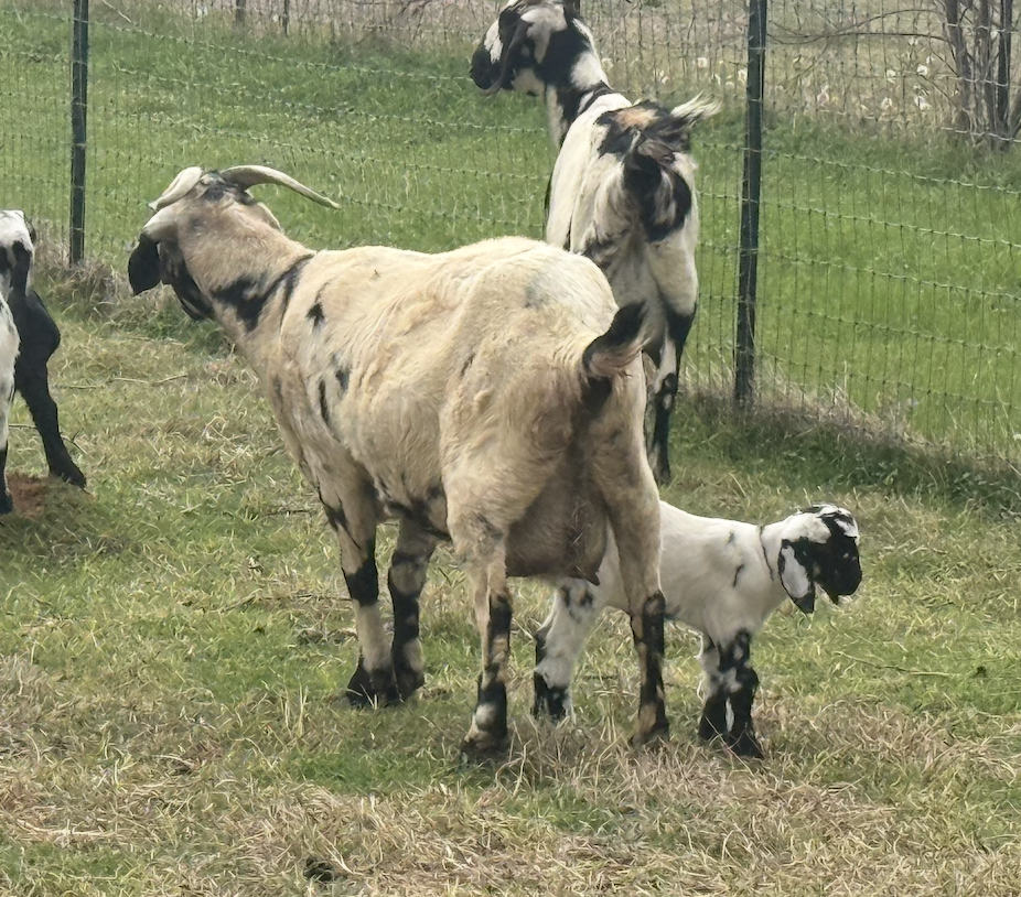 Our ABGA registered does range from fullbloods (100%) to 87.5% American-breds. As we continue to work to improve our herd genetics we expect to increase percentages of our breeding does over time. The lower percentage does were chosen specifically for their impressive colors and temperaments. Our breeding stock are rarely for sale but you are free to inquire if you are interested in a mature doe.